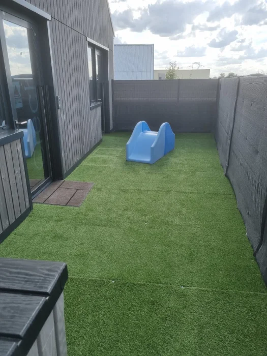 Un jardin de 32 m², sécurisé et aménagé avec des jeux adaptés à chaque âge